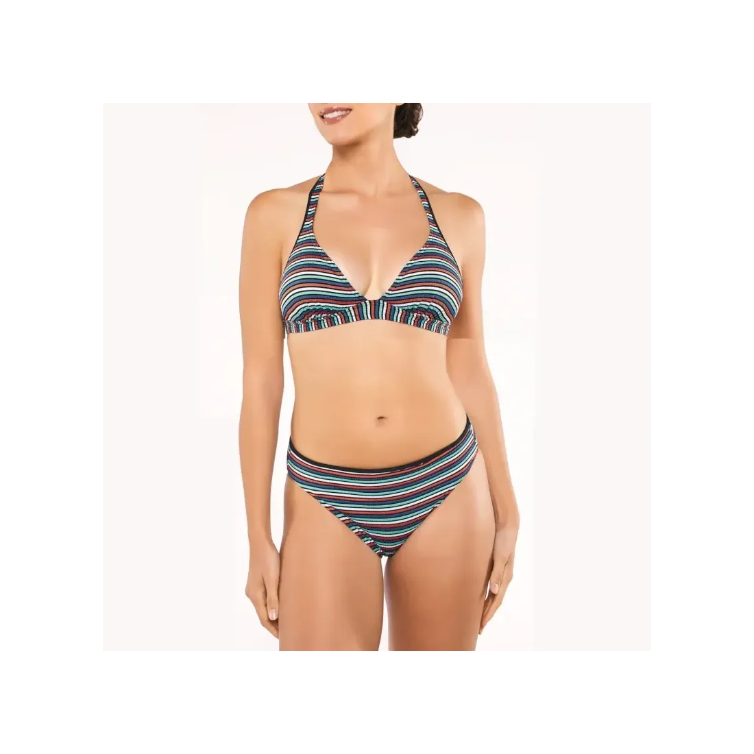 Biquini triangular i copes amb foam. Model Lola de la marca Onades. Biquini alegre amb estampat de ratlles multicolor.