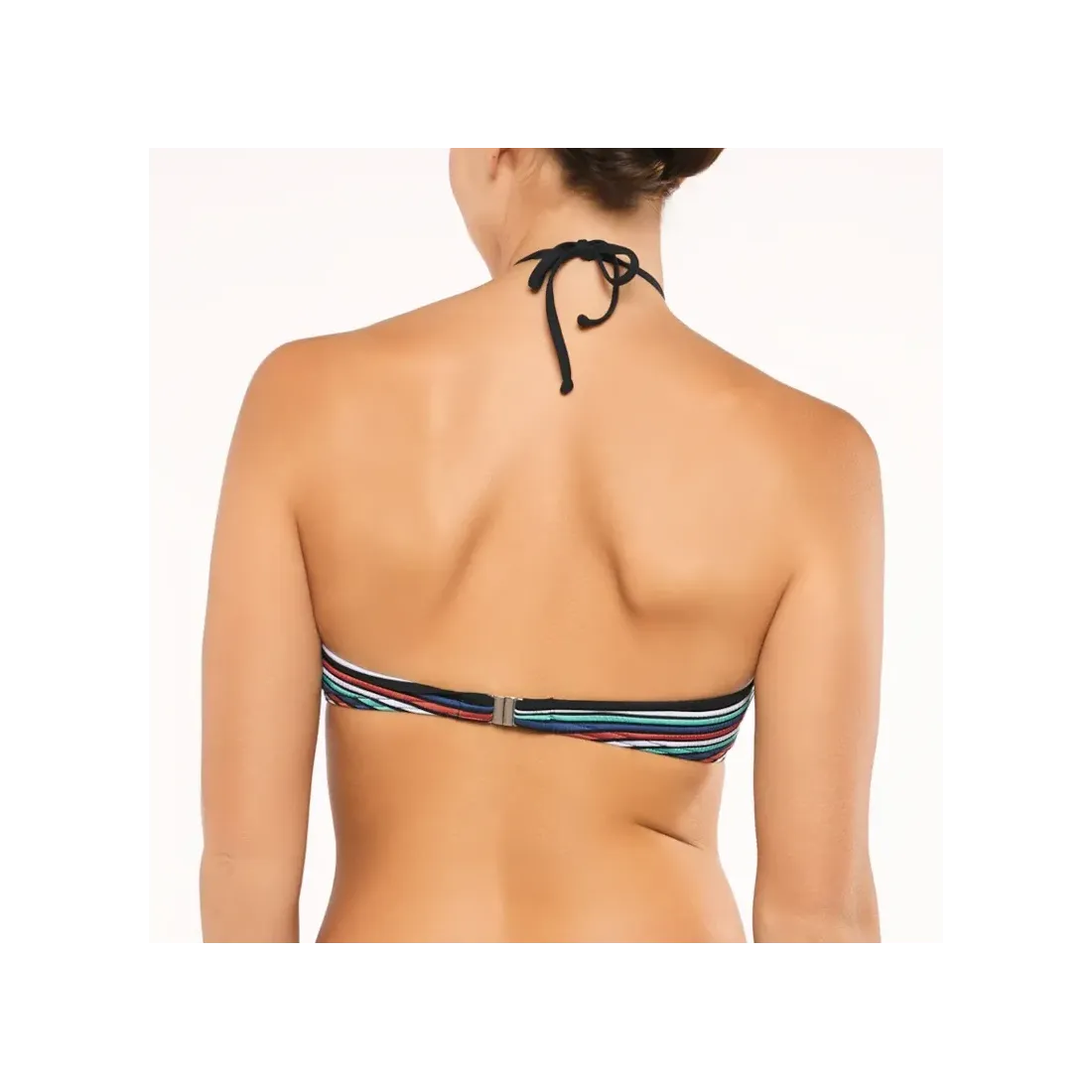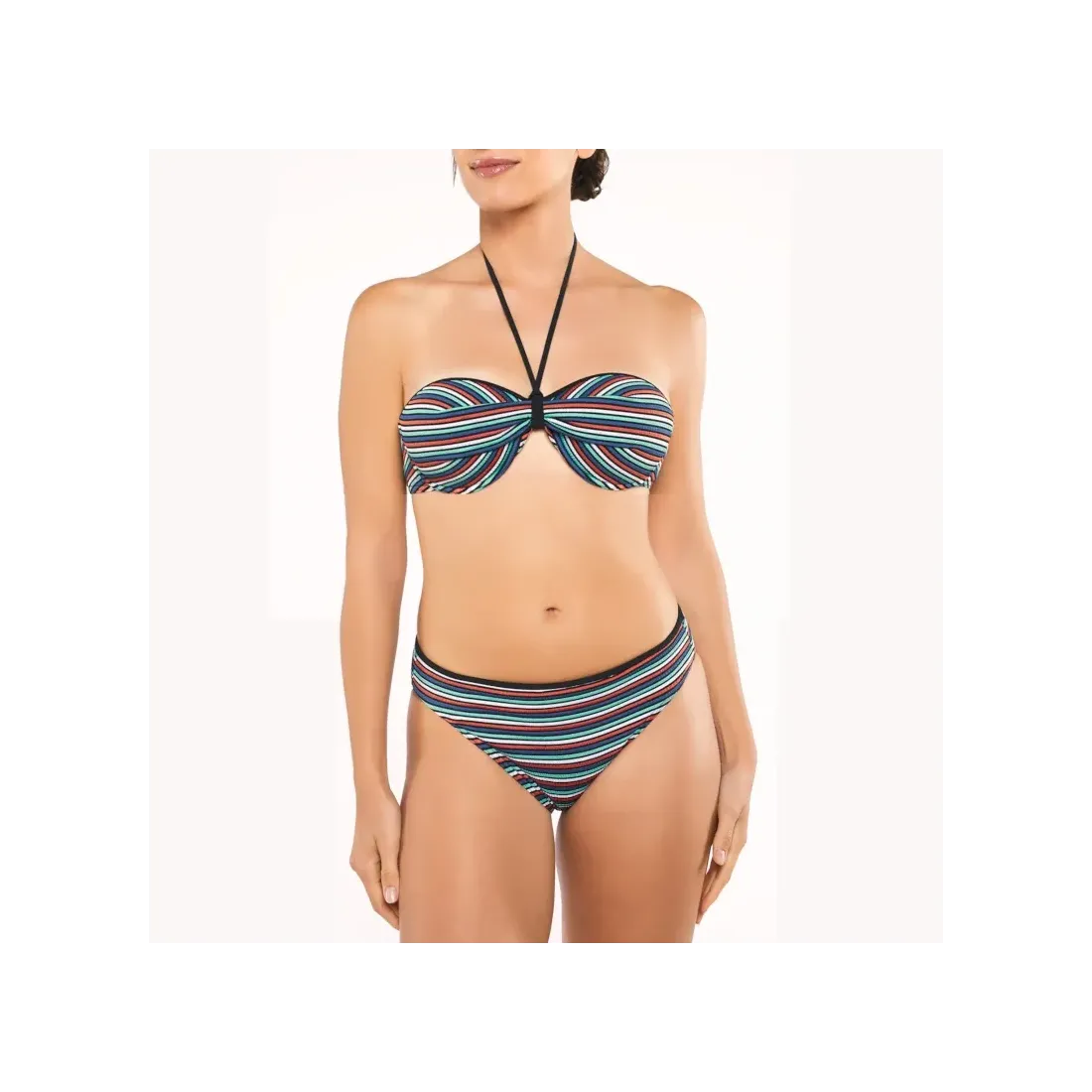 Biquini bandeau. Model Lola de la marca Onades. Disseny de moda alegre i d’esperit jove. Estampat de ratlles multicolor. Cèrcols i foam a les copes. Calceta slip.