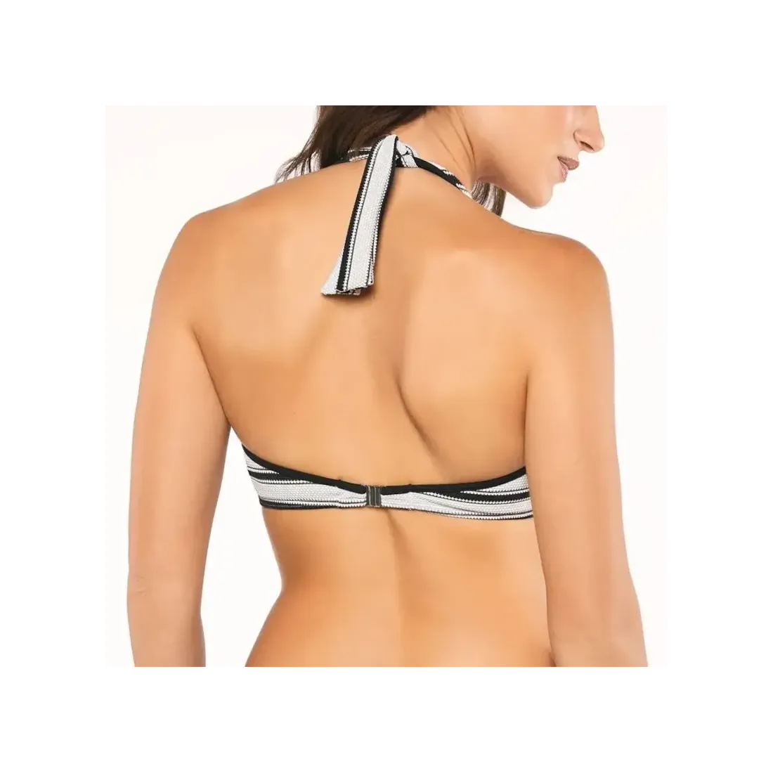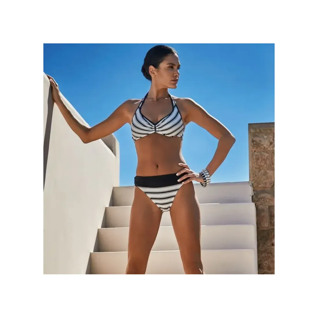 Biquini halter de la marca Onades. Col·lecció Amal. Disseny mariner, elegant i sofisticat. Copes amb foam i folre de color blanc. La calceta també porta folre de color blanc.