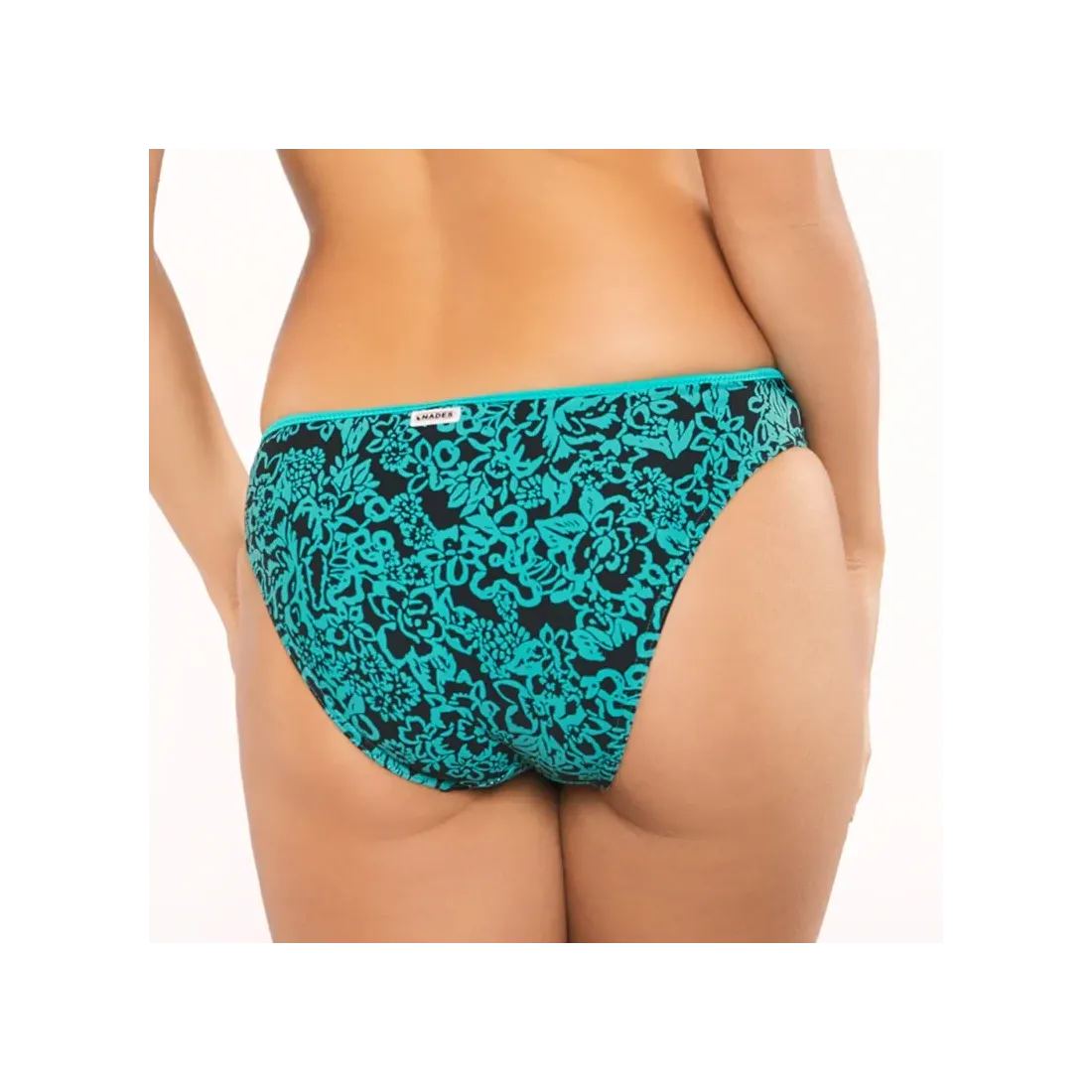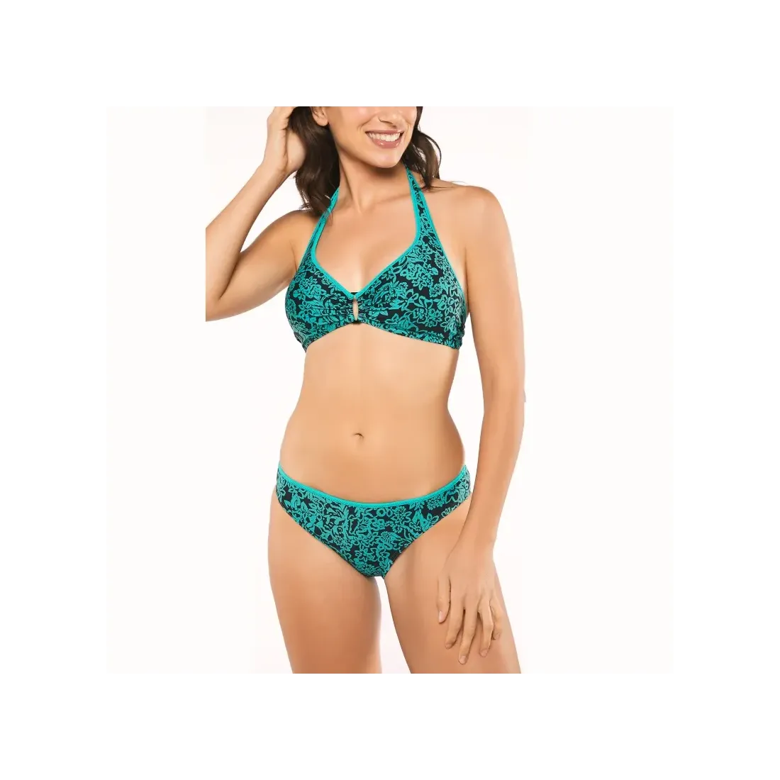 Biquini halter d’Onades. Col·lecció Maren. Estampat de flors en contrast dels colors negre i turquesa.