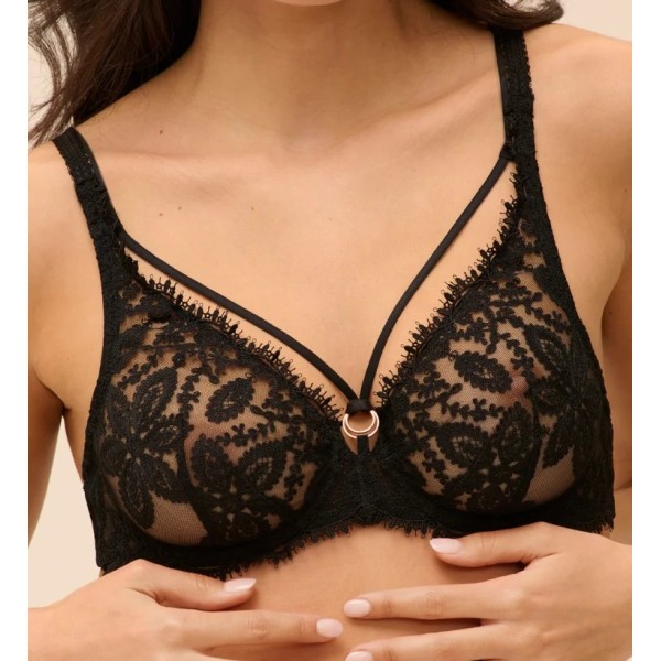 Sostenidor triangular amb cèrcols de la marca Précieuse. Col·lecció Précieuse amb la referència 1G3309. Banda de coll extraïble amb detalls de joia. Escot realçat. Esquena de tul. Tires elegants i ajustables. Confecció amb fibres reciclades Simone Cares.