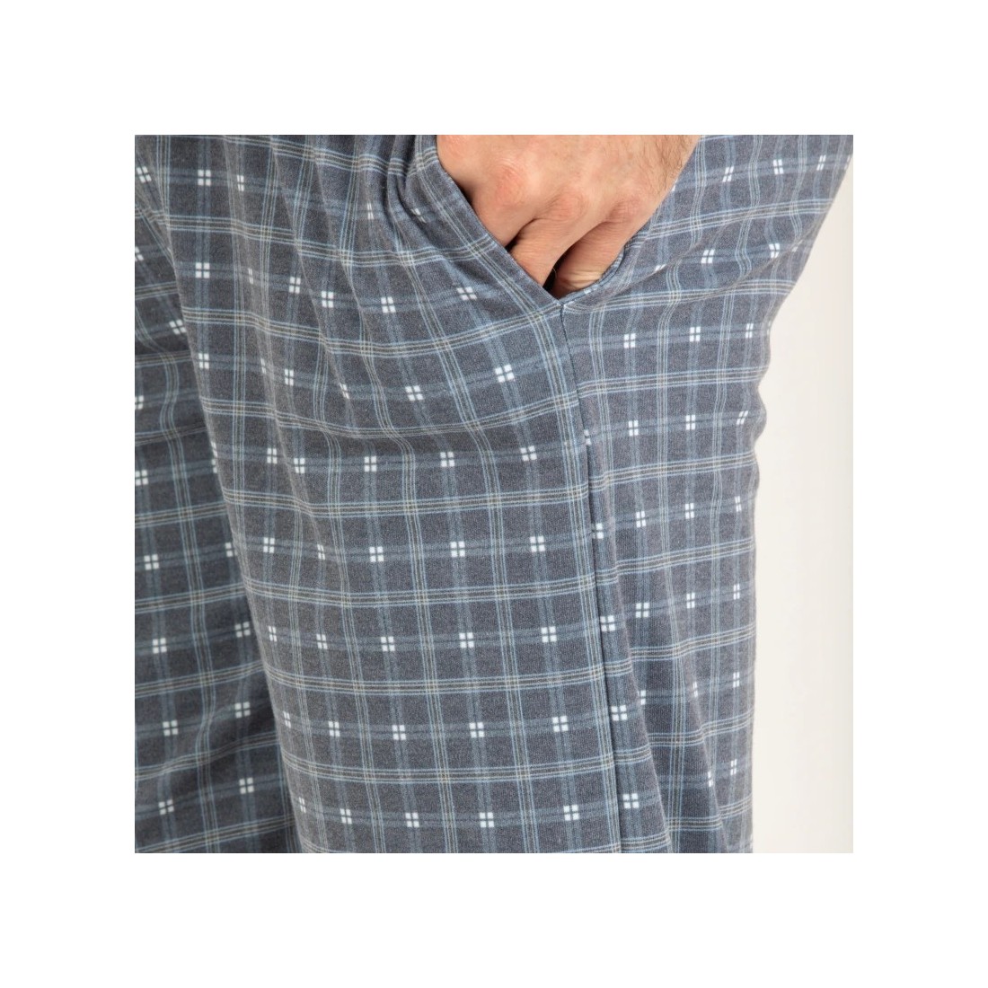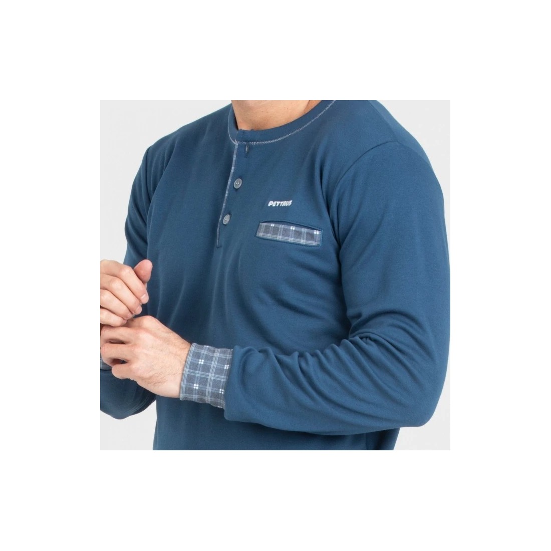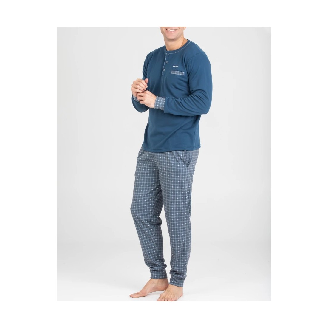 Pijama llarg de Pettrus. Referència 5934. Pantalons de quadres amb butxaques laterals. Samarreta superior amb obertura de botons al coll i una butxaca.