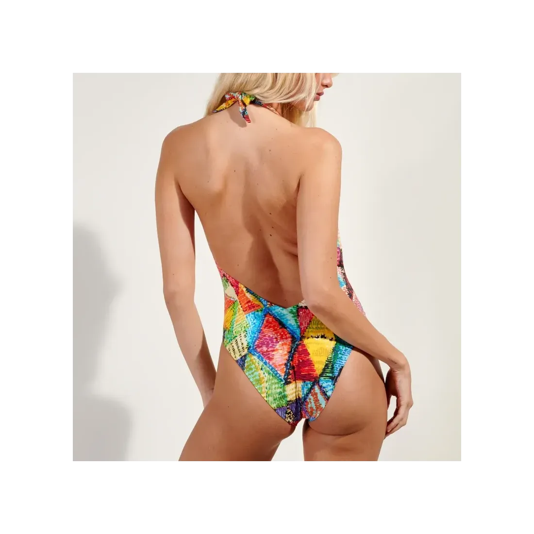 Bañador de la marca Pain de Sucre. Diseño de moda con un estampado de color espectacular. Escote profundo con copas sin aros. Espalada abierta.