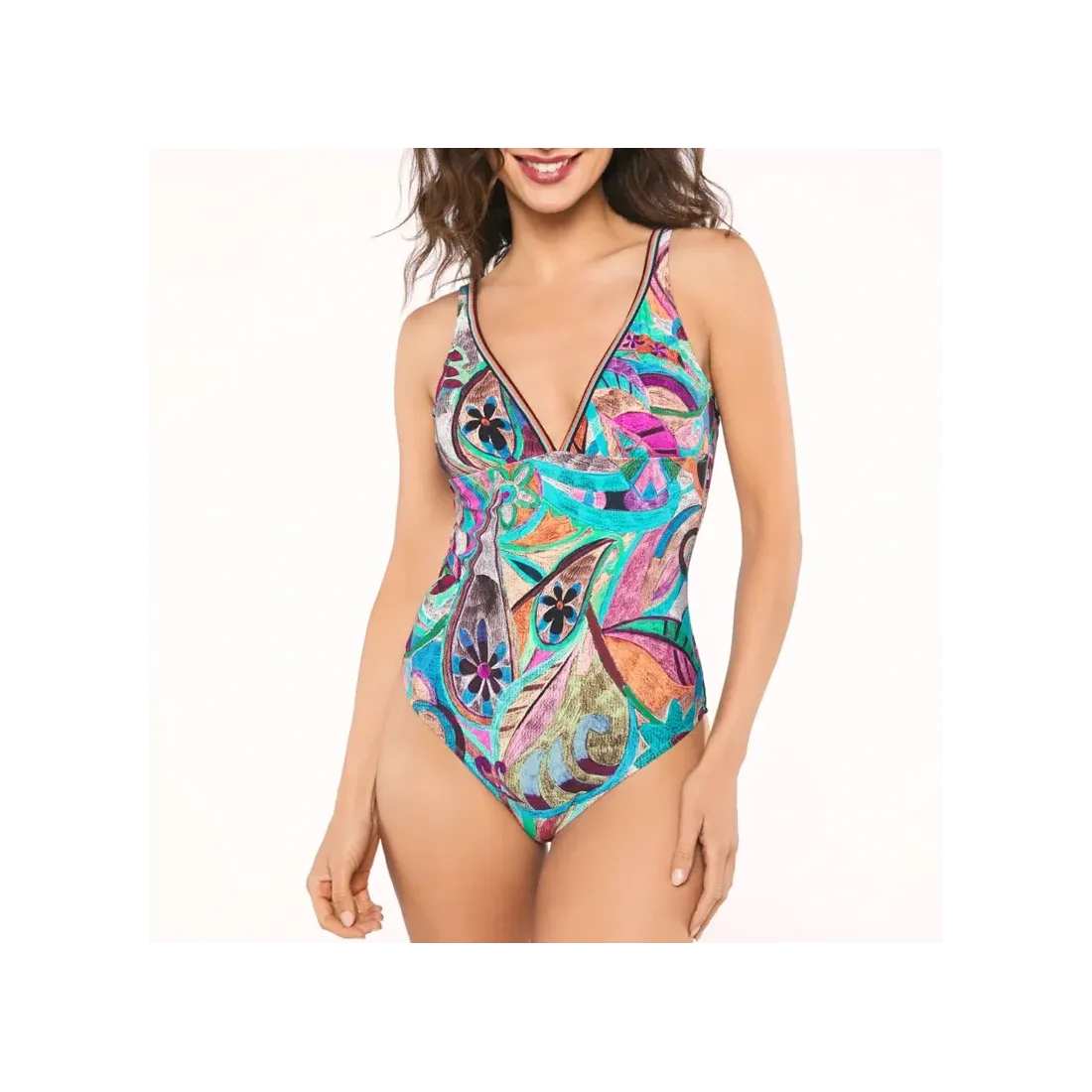 Bañador Red Point con escote profundo. Colección Abby 1013331. Bañador triangular con foam extraible en las copas. Tirantes regulables. Estampado de moda.