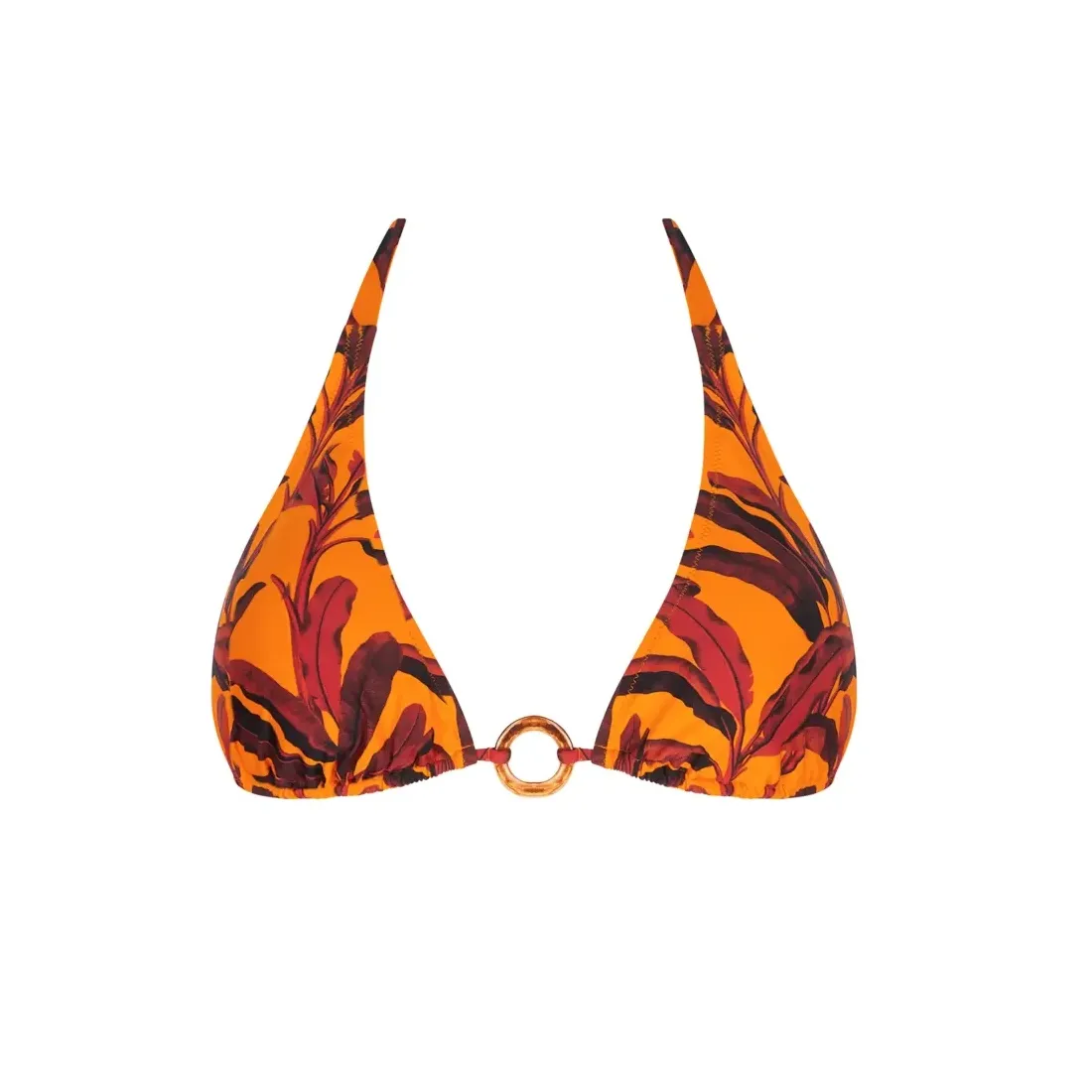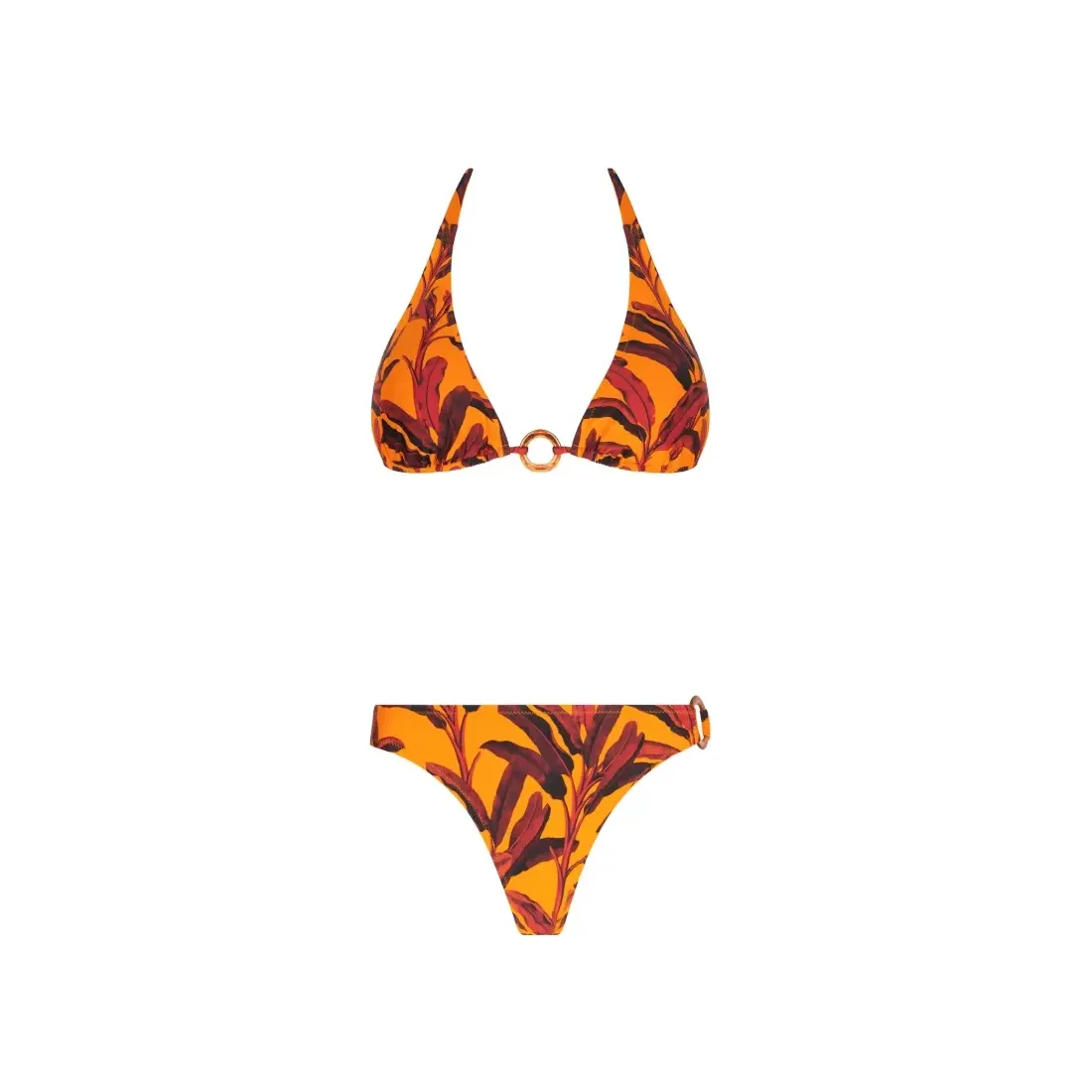 Bikini cortina de la marca Antigel. Diseño de la colección La Melanesia con la referencia EBB2759. Bikini triangular con foam ligero en las copas y con un estampado de moda veraniego. Braguita slip seductora con anilla decorativa.