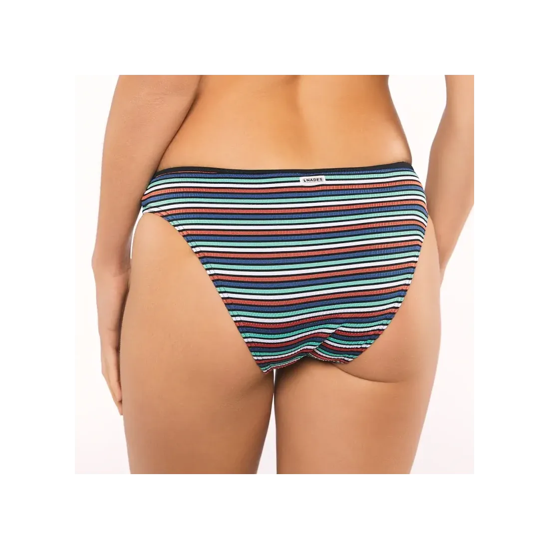 Bikini bandeau. Modelo Lola de la marca Onades. Diseño de moda alegre y de espíritu joven. Estampado de rayas multicolor. Aros y foam en las copas. Braguita slip.