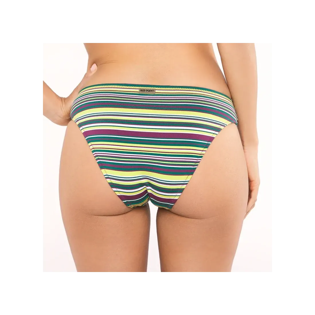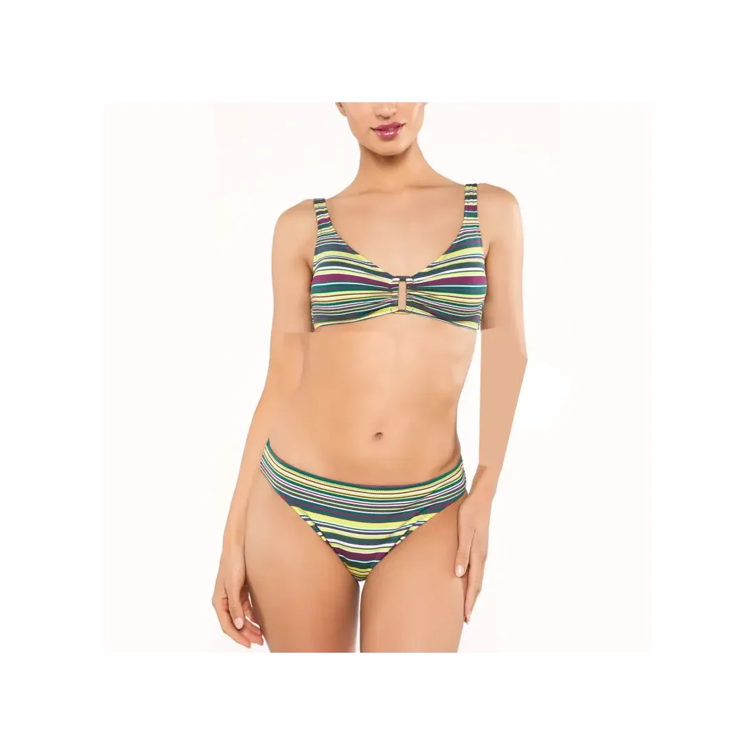 Bikini halter de Red Point. Diseño con rayas horizontales de tonos cálidos y vibrantes que transmiten harmonia. Tirantes cómodos y regulables. Braguita slip.