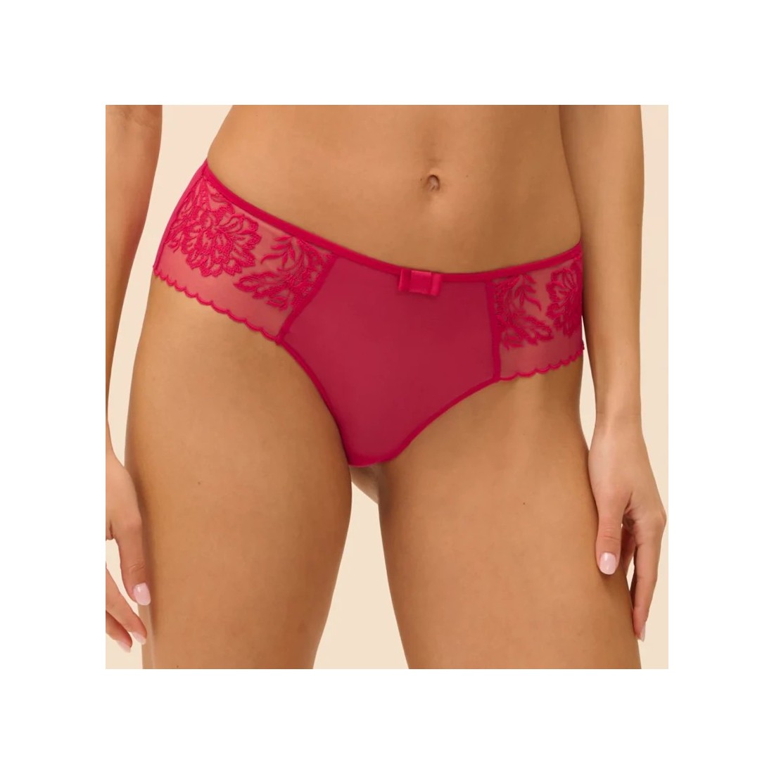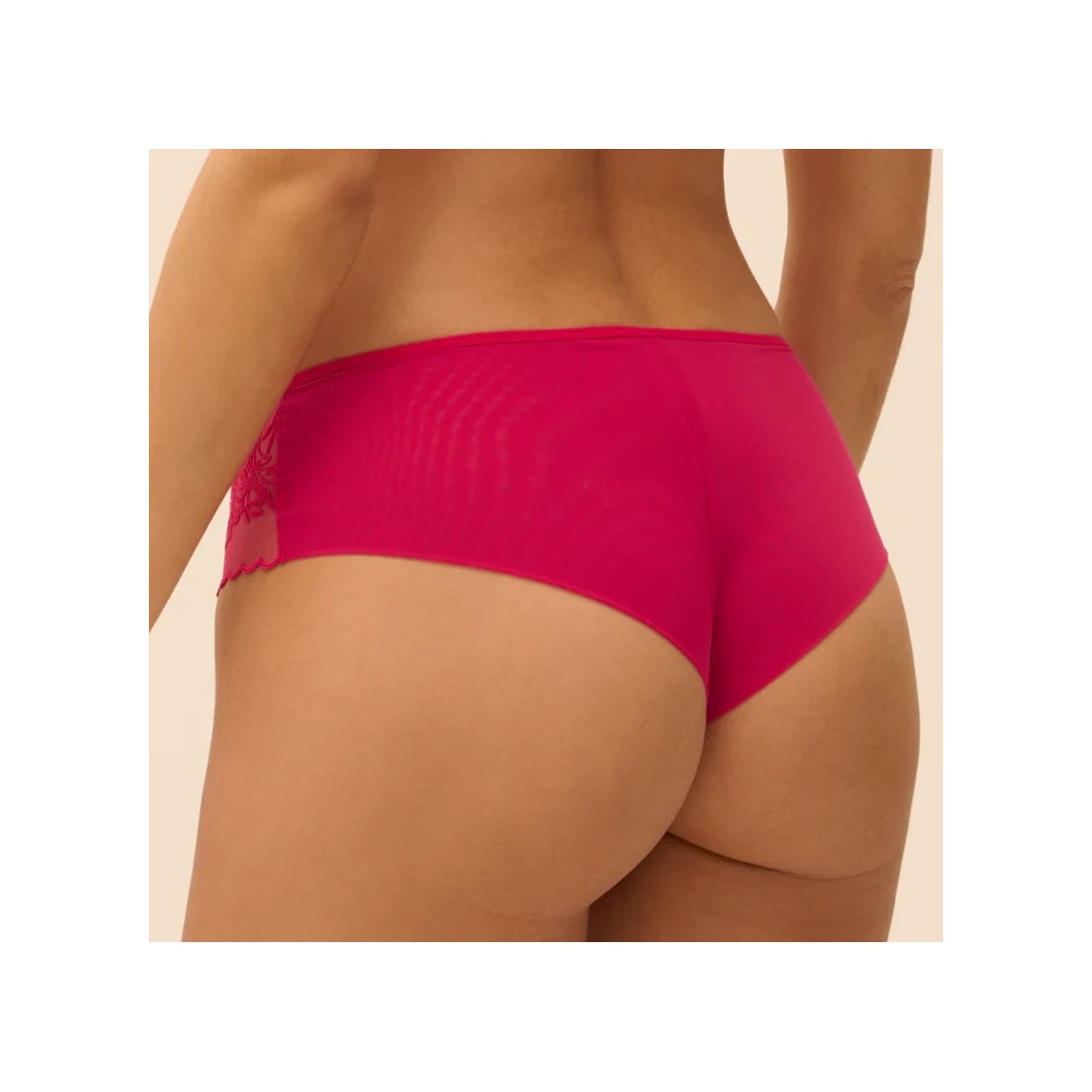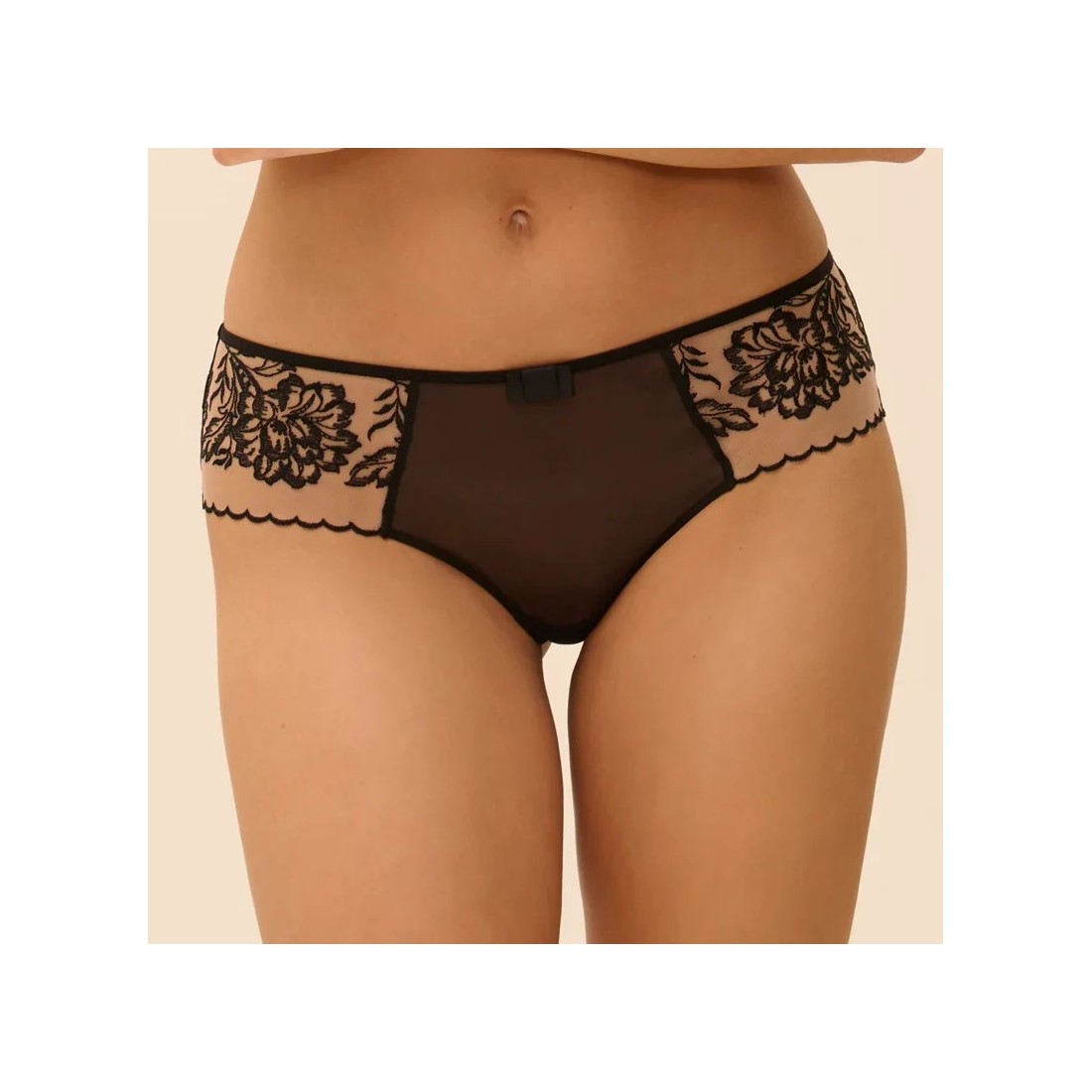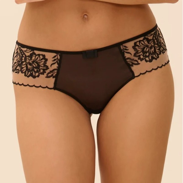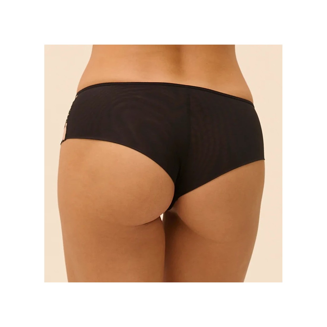 Shorty de moda de la marca Simone Pérèle. Colección Romance con la referencia 1G2630. Shorty bordado y con tul. Espalda plisada de tul para uso invisible bajo la ropa exterior. Entrepierna de algodón. Fibras recicladas.
