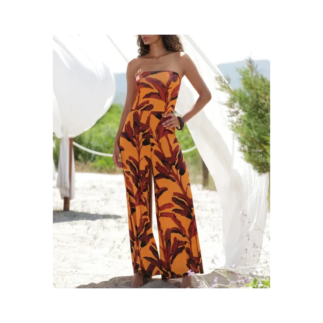 Mono pantalón de Antigel. Colección La Melanesia. Diseño con forma de bustier, de punto estampado y sin arrugas. Cintura con elástico. Camal ancho. Se puede llevar como pantalón, con la parte del bustier doblada hasta la cintura. Es una prenda multifuncional e ideal para diferentes situaciones.