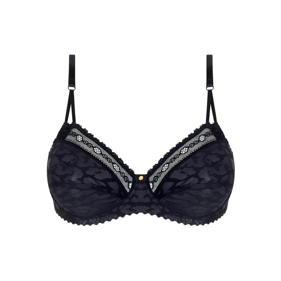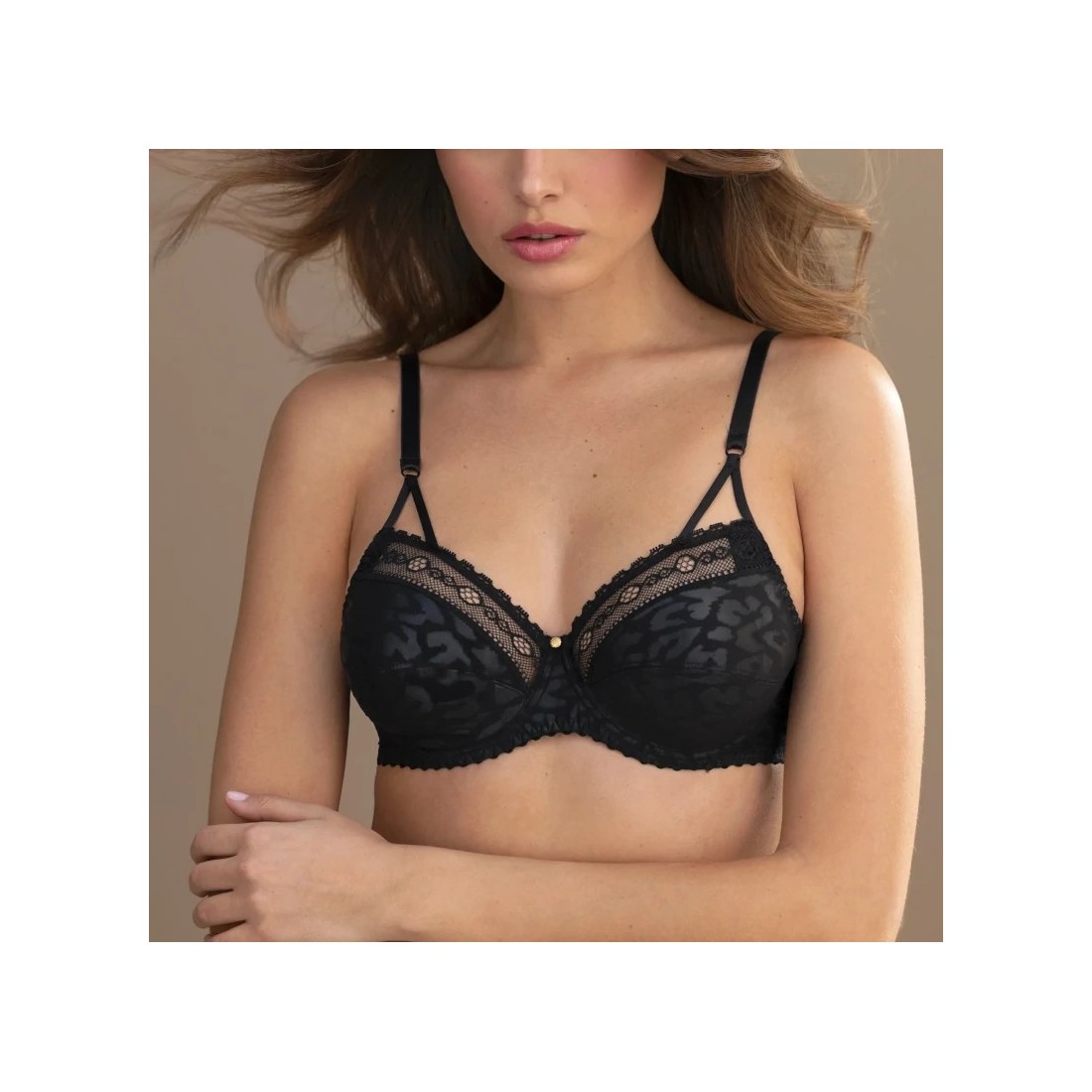 Sujetador con aros de la marca Antigel. Referencia ECJ6038 de la colección Sensualite Fauve. Diseño de moda, sensual y cómodo. Copas de cobertura completa. Inserción de encaje en el escote. Tirantes finos, cómodos y regulables.