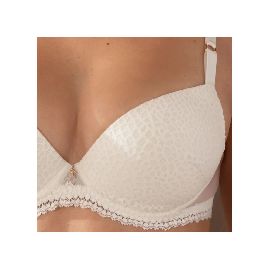 Sujetador con foam y aros de la marca Antigel. Modelo ECJ8047 de la colección Exquise En Dentelle. Modela y realza el busto. Diseño con encaje, moderno y elegante. Banda de tul y detalle de joya en el centro. Tirantes cómodos y ajustables.